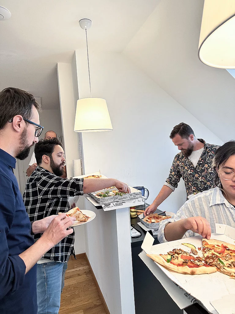 Abgelichtet hat uns die Fotografin Nikky Maier mit einem Assistenten bei uns in der Agentur in München. Dafür hat Nikky ihr mobiles Studio mitgebracht und Licht und Hintergrund im Büro aufgebaut. Unsere erste Mission des Tages war es, einheitliche Porträtfotos in Schwarz-Weiß vor einem schwarzen Hintergrund für unsere neue Teamseite zu machen. Dabei lag der Fokus darauf, die Köpfe unseres Teams gut auszuleuchten, um kontrastreiche Aufnahmen zu bekommen, die den individuellen Charakter zum Ausdruck bringen. Mission Nr. 2 war es, den Agenturalltag von visionbites auf authentische Weise festzuhalten. Dafür haben wir uns vor unseren Bildschirmen, am Besprechungstisch und natürlich beim Rumblödeln und Pizza essen aufnehmen lassen. Die Bilder dienen als zukünftiger Content für die Homepage und Social Media von visionbites, um einen echten Einblick in unsere Arbeitsatmosphäre zu geben.
