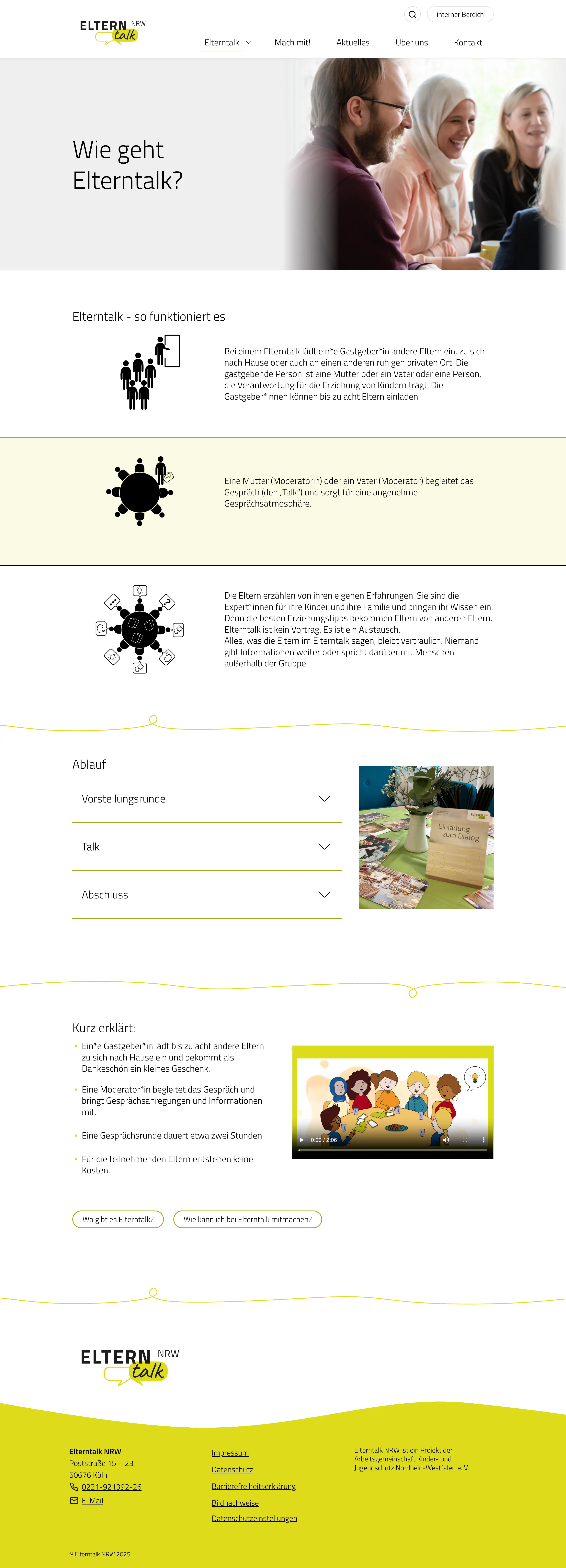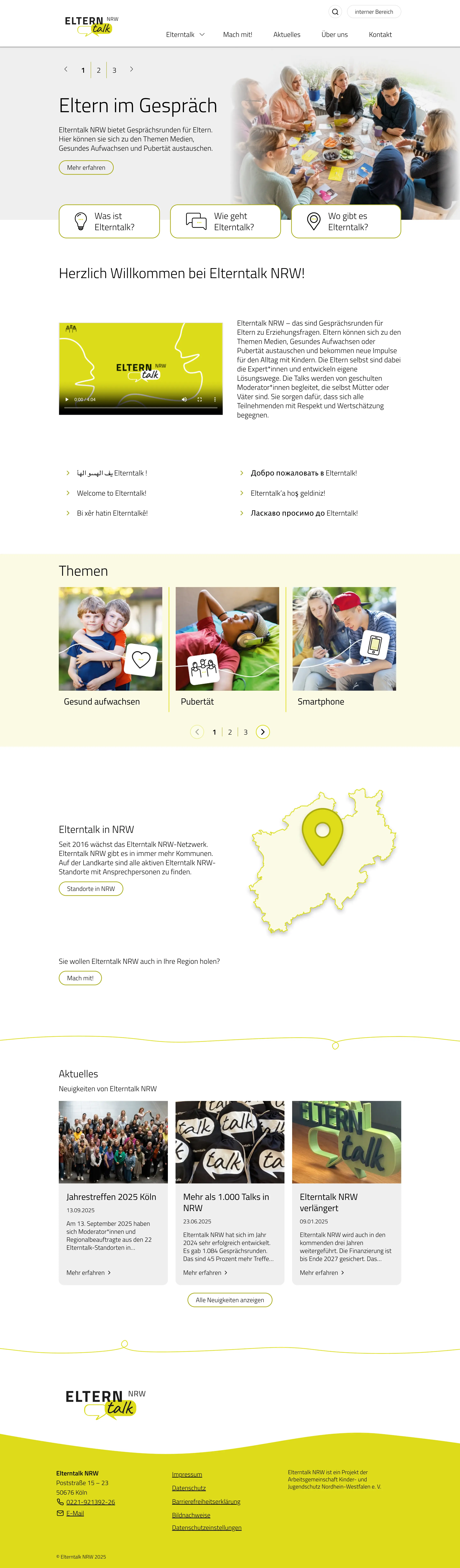 Der Relaunch der Elterntalk-NRW-Website mit Kirby CMS verbindet klare Informationsarchitektur, Mehrsprachigkeit, technische Stabilität und neue Tools für ihre Projektarbeit. Damit stärkt die Website das zentrale Ziel von Elterntalk NRW: Eltern zu unterstützen und den Austausch über Erziehungsfragen sprachunabhängig zu fördern.